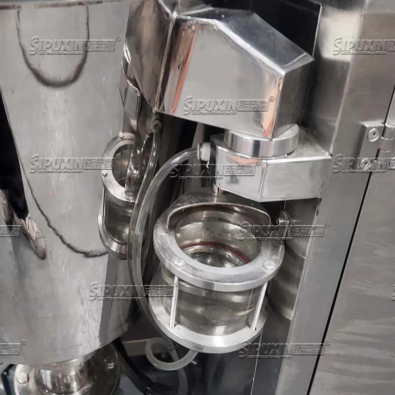It is internal and external homogenizing. The material at the bottom will be sucked into the pipe by the strong force of the homogenizer.More and more material accumulate,squeezes each other.Then they return to the main pot for next round of mixing and emulsion. So no matter the material is at the top,in the middle or at the bottom.All the material can be mixed and emulsified evenly,no dead corner.